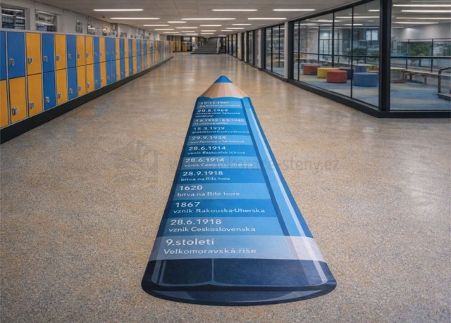 Proměňte školní chodbu v interaktivní časovou osu českých dějin. Originální podlahová samolepka ve tvaru tužky propojuje vzdělávání, pohyb a moderní design. Žáci doslova procházejí historií – od Velkomoravské říše až po sametovou revoluci.